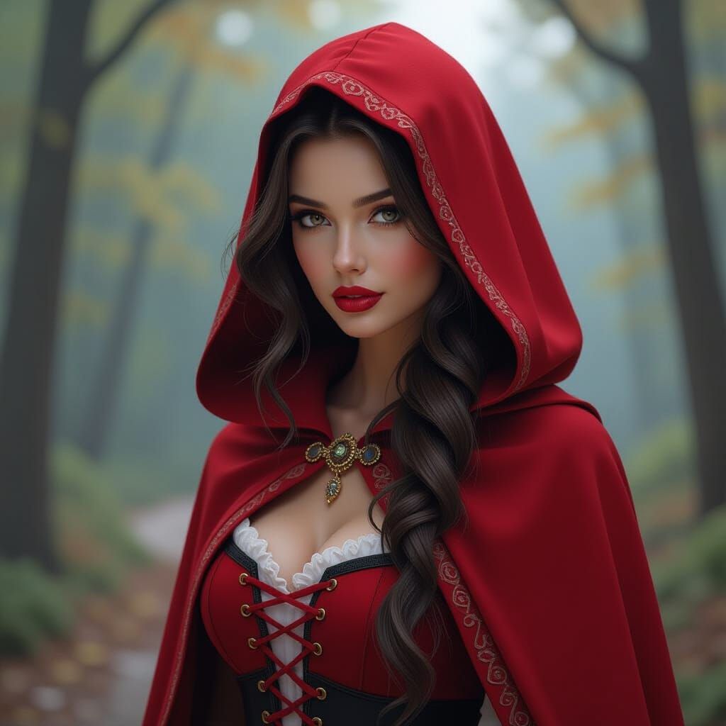 This image showcases a detailed fantasy concept art of Red Riding Hood, featuring deep colors and intricate details in a matte painting style.