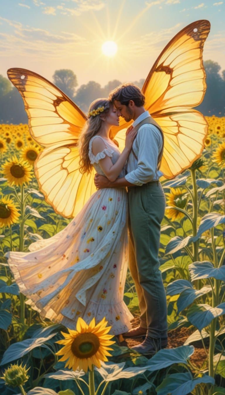 This image shows a butterfly couple dancing on a giant sunflower in a wildflower field. The artwork is rendered in the style of an impressionist watercolor painting with soft pastel colors.