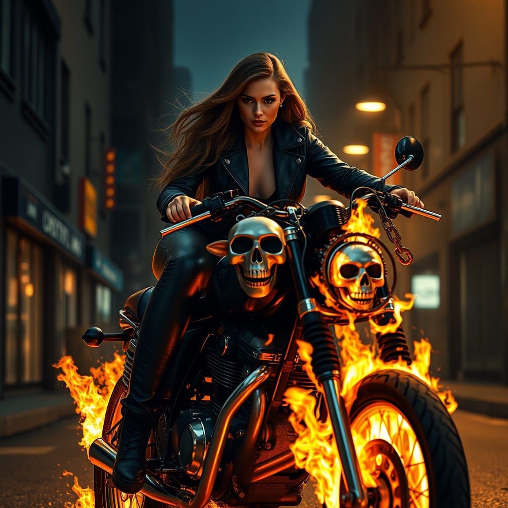 A striking image of a woman riding a blazing motorcycle through a dimly lit city street, with a focus on realistic textures and cinematic lighting, evoking a sense of high-octane action and fierce determination.