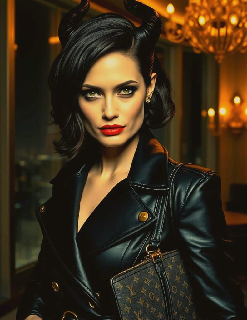 "A stunning and sophisticated female villain, Maleficent, Angelina Jolie version , in a high-fashion full- body portrait. She has sharp, piercing eyes with a cold, calculating gaze, perfectly styled dark hair (choose: sleek bob/wavy locks), and flawless makeup with a bold red lip. Sheβs wearing a tailored ...