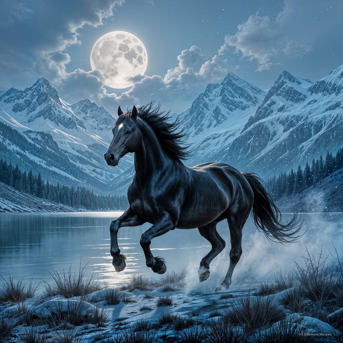 This image shows a steel grey horse galloping in the moonlight. The horse has black legs, a black mane and tail, and dun markings. Mountains and a lake cover the background.