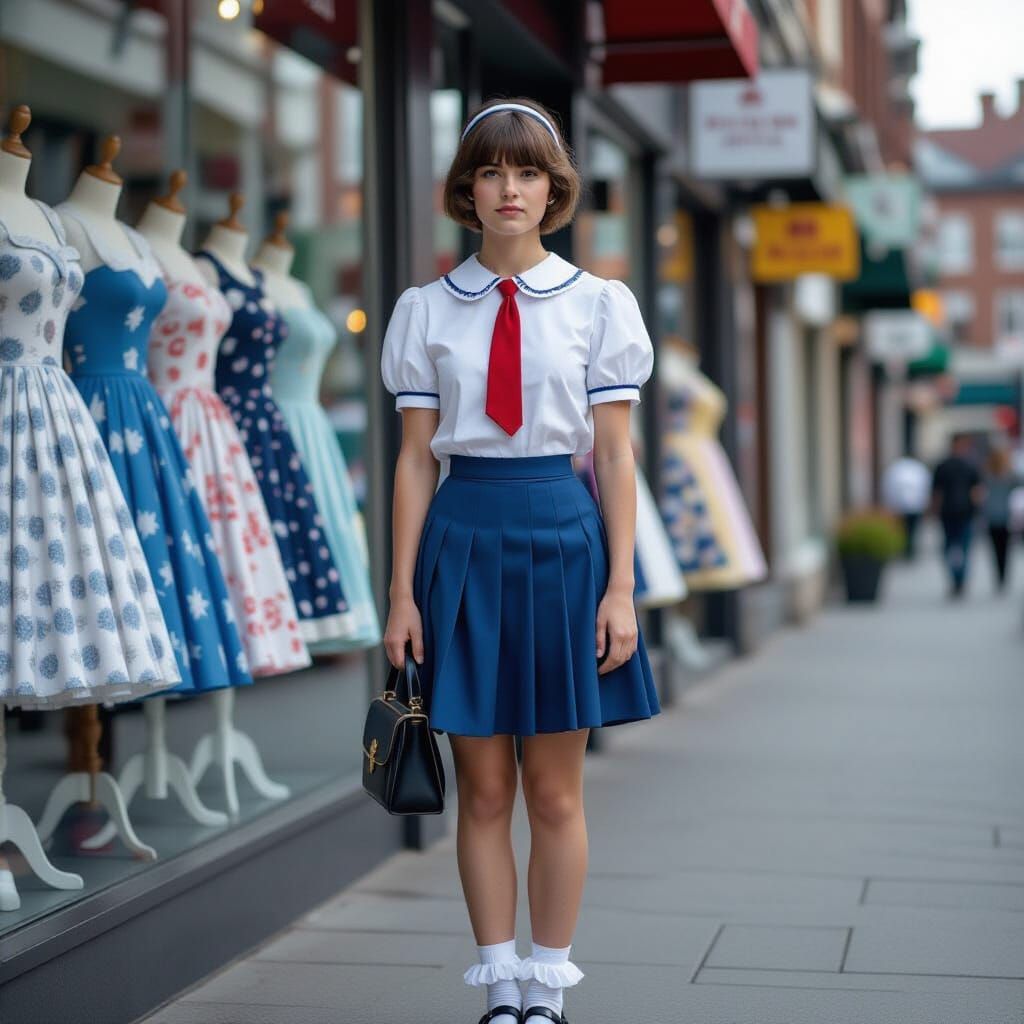 This image shows a tall, slender 19-year-old man in a white blouse with a blue-trimmed Peter Pan collar, a red tie, and a blue skirt. The cinematic image evokes a dramatic, film-like quality.