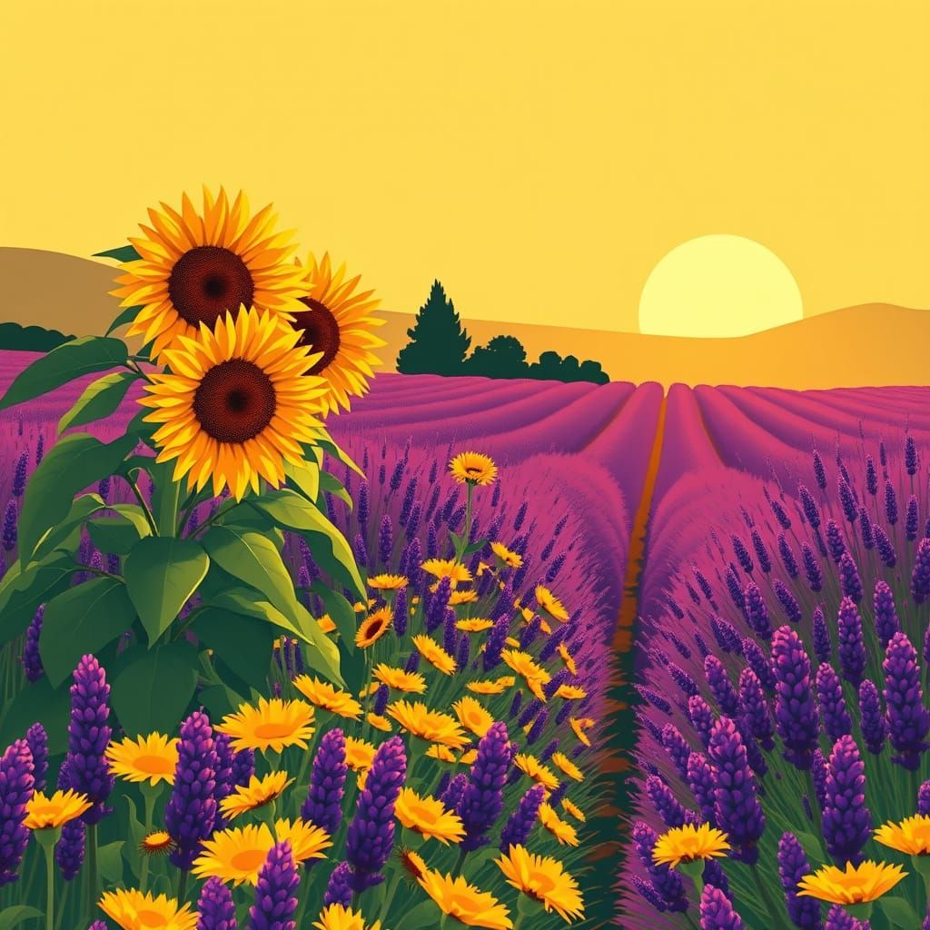 A vintage travel poster of Provence, France, featuring sunflower and lavender fields bathed in golden light. The image captures a nostalgic, retro aesthetic with bold Art Deco lines.