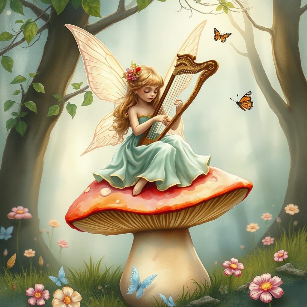 A whimsical scene of a fairy girl playing a harp on a mushroom in a magical forest. The image is a highly detailed watercolor illustration with hyper-realistic textures and vibrant colors.