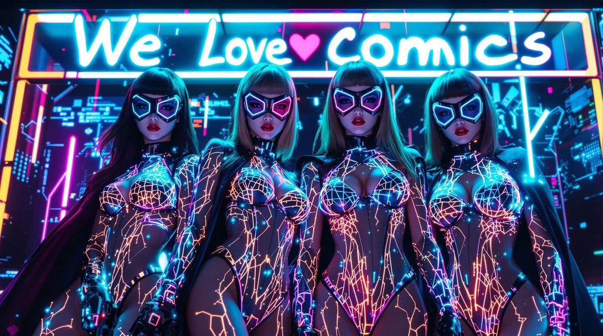 This image showcases four hyperrealistic female characters in futuristic holographic L.E.D. costumes, set against a vibrant synthwave background, with dynamic poses and alluring expressions.