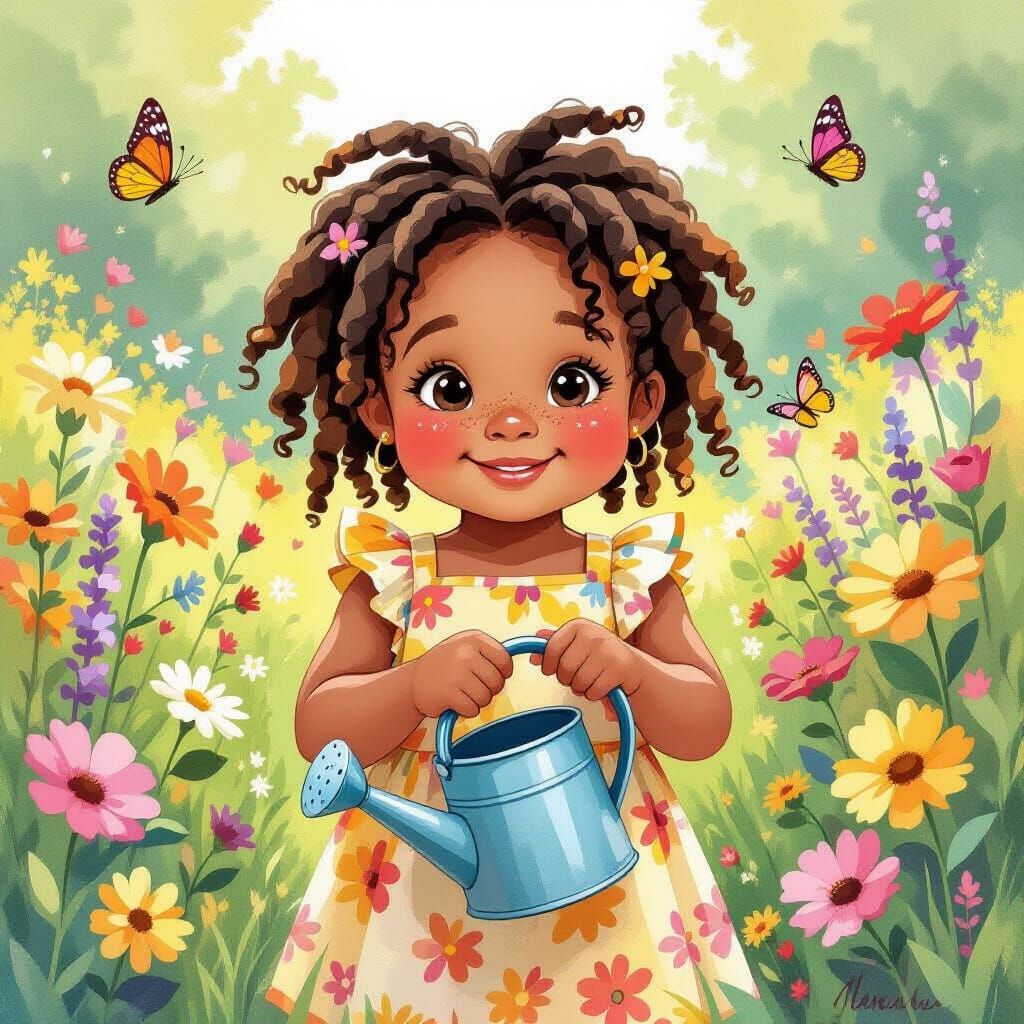 A heartwarming image of a young African American girl tending a colorful flower garden. She wears a bright sundress and waters the plants, surrounded by butterflies. The artwork features soft textures reminiscent of watercolor.