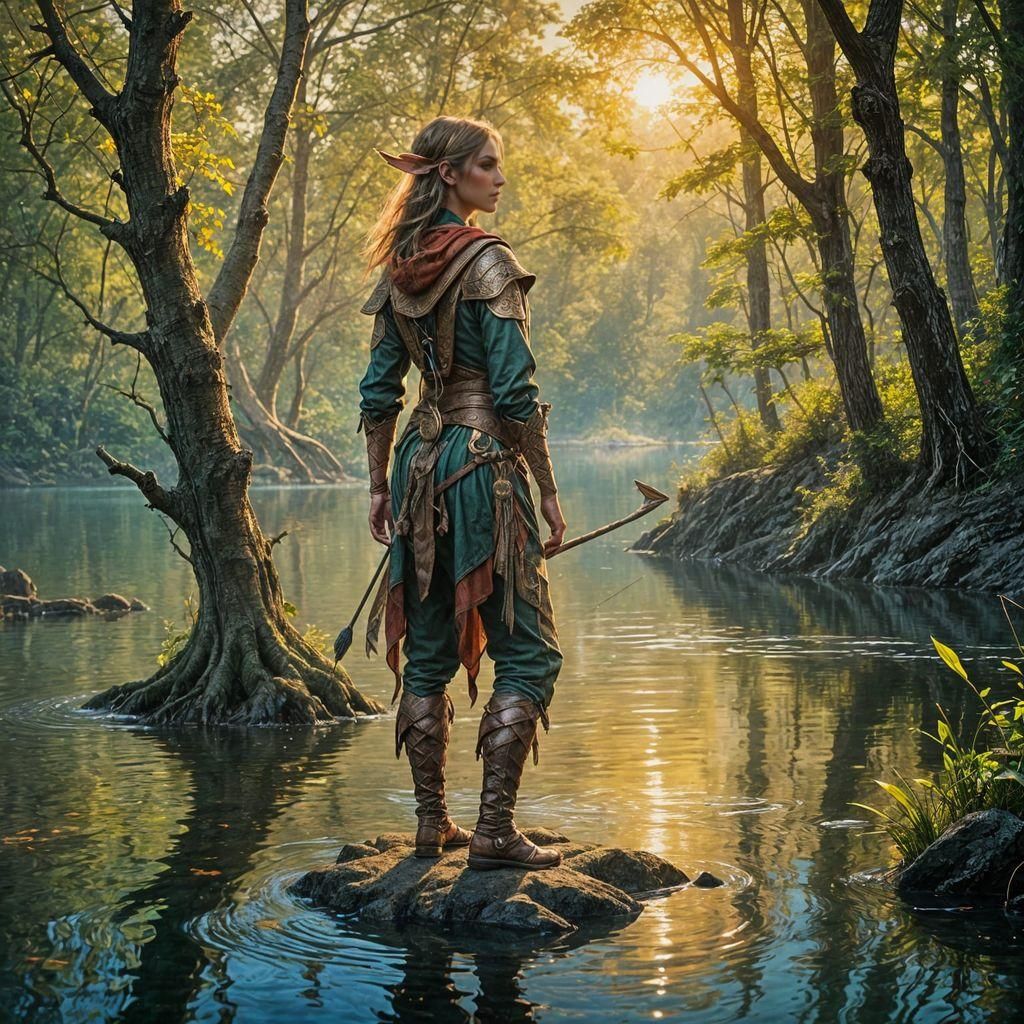 A striking picture of a wood elf fisherwoman by a scenic lake. This highly detailed digital portrait, rendered with dynamic lighting and intricate detail, captures a cinematic and atmospheric scene.