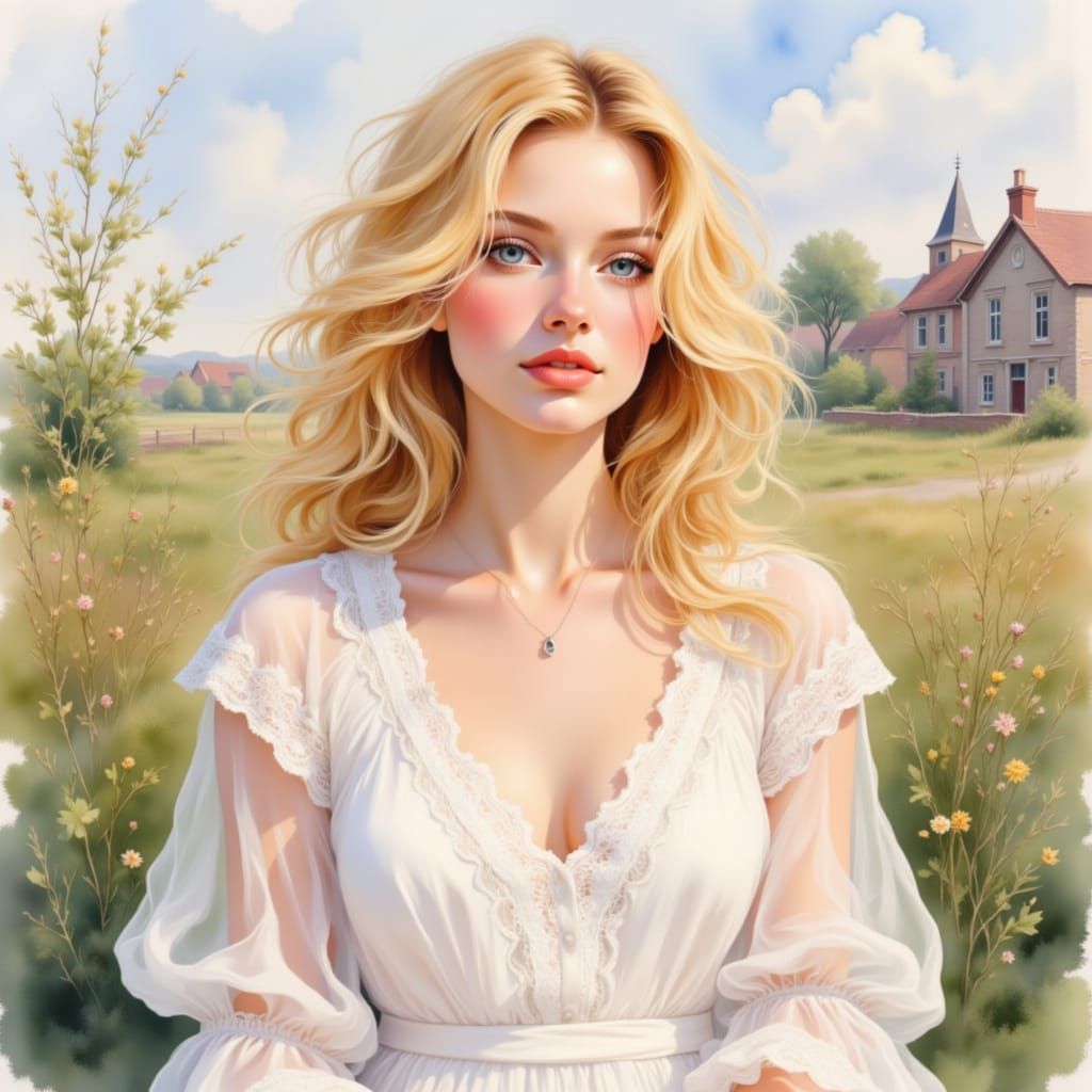 A serene half-length portrait of a blonde woman with a gentle gaze, set against a soft pastel village backdrop. Rendered in a romantic impressionist style with diffused lighting.