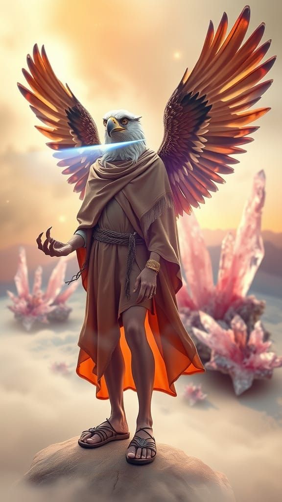 Create a vertical phone wallpaper with 20% surrealism and 80% abstract horror, featuring a humanoid figure with the head, feathered wings, and taloned feet of a radiant eagle, its piercing gaze cutting through mist, wings pulsing with ethereal light, ...