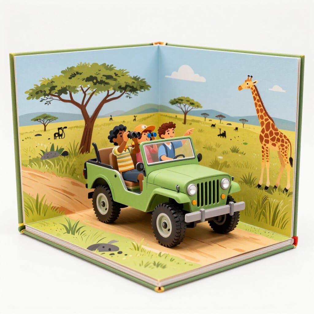 Generate your own unique popup book images, including people in jeeps on safari, with our free and easy AI tool.