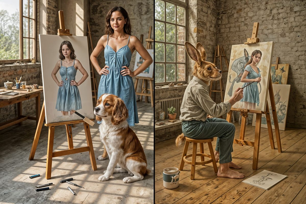 This image shows an artist's studio filled with creativity. A woman poses beside her portrait, while a dog playfully draws. A rabbit paints its own likeness in a whimsical scene, all bathed in soft natural light.