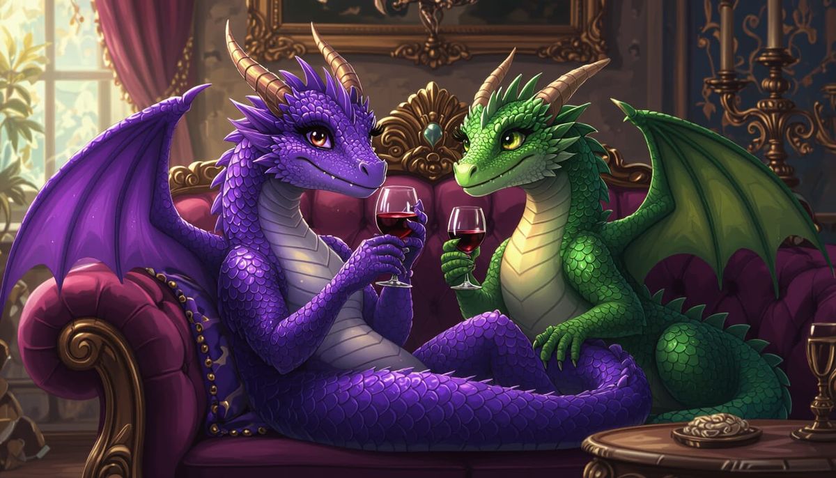 This image shows two anthropomorphic dragons enjoying glasses of wine. The dragons, one purple and one green, are relaxing together on an ornate couch as 3D rendered digital art.