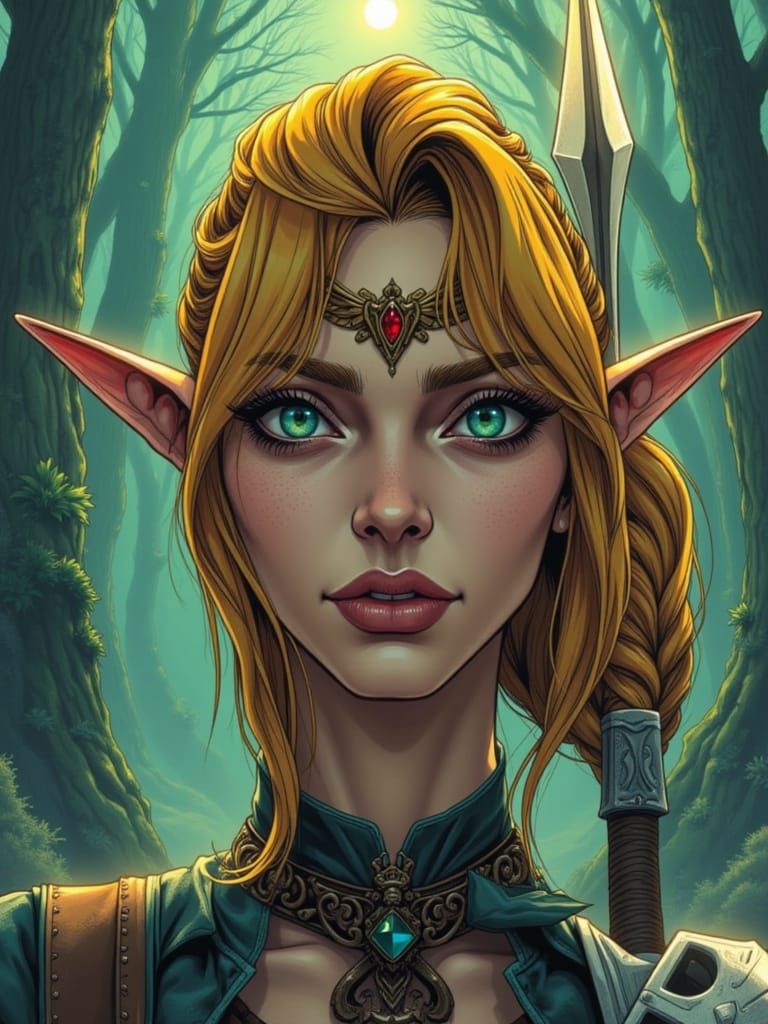 A photorealistic depiction of a woman cosplaying as Link from Zelda, holding a sword. The image features intricate details and vibrant colors, presented in a graphic novel art style.