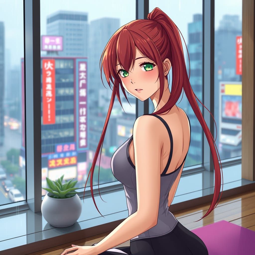 This image shows a serene yoga scene set against the backdrop of a rainy Shibuya morning. A delicate Japanese woman in a yoga studio, surrounded by natural light pouring in through the floor-to-ceiling windows, embodies a sense of inner peace and connection with nature.