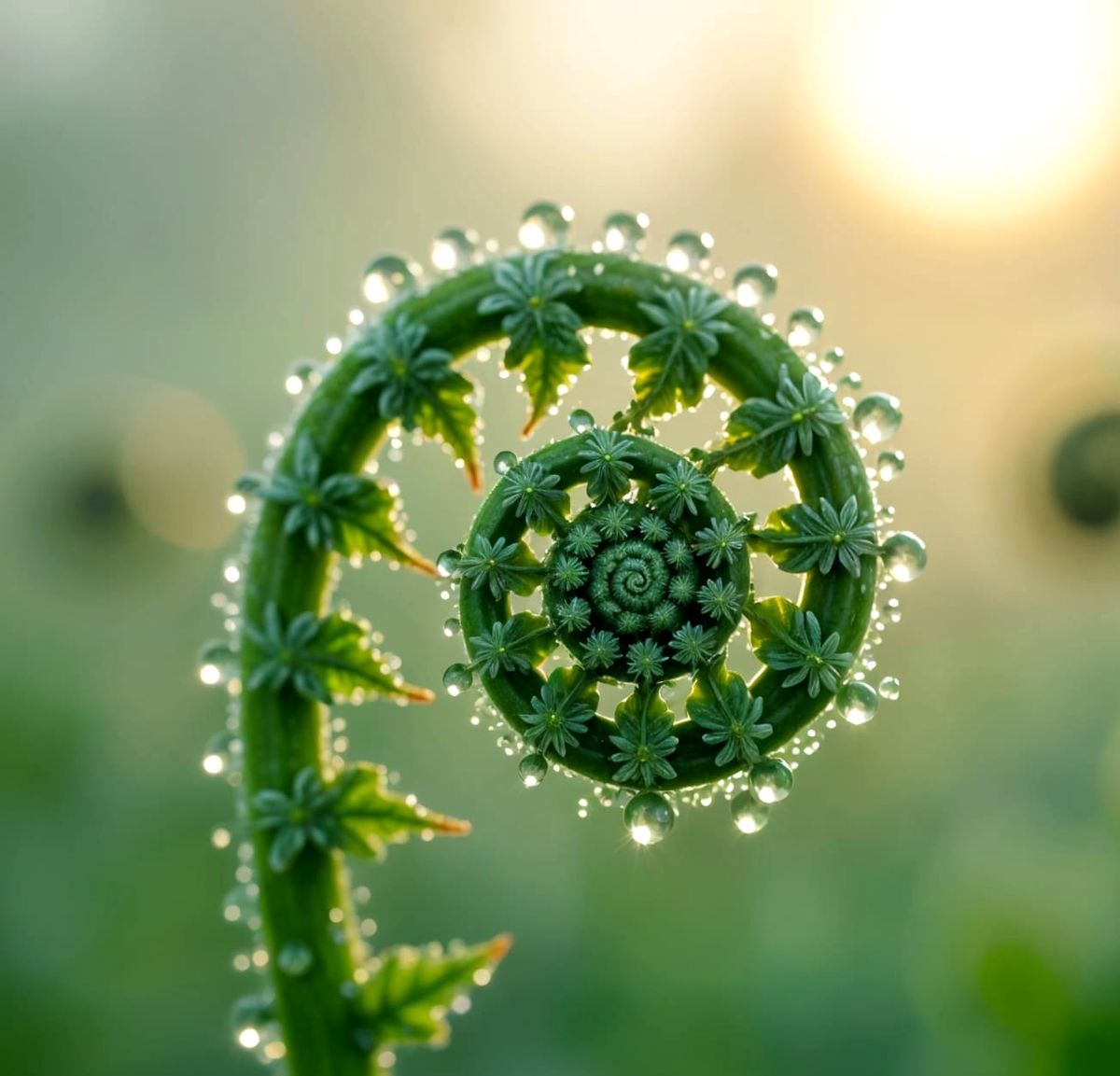 Macro Fiddlehead Fern Spiral with Dewdrops