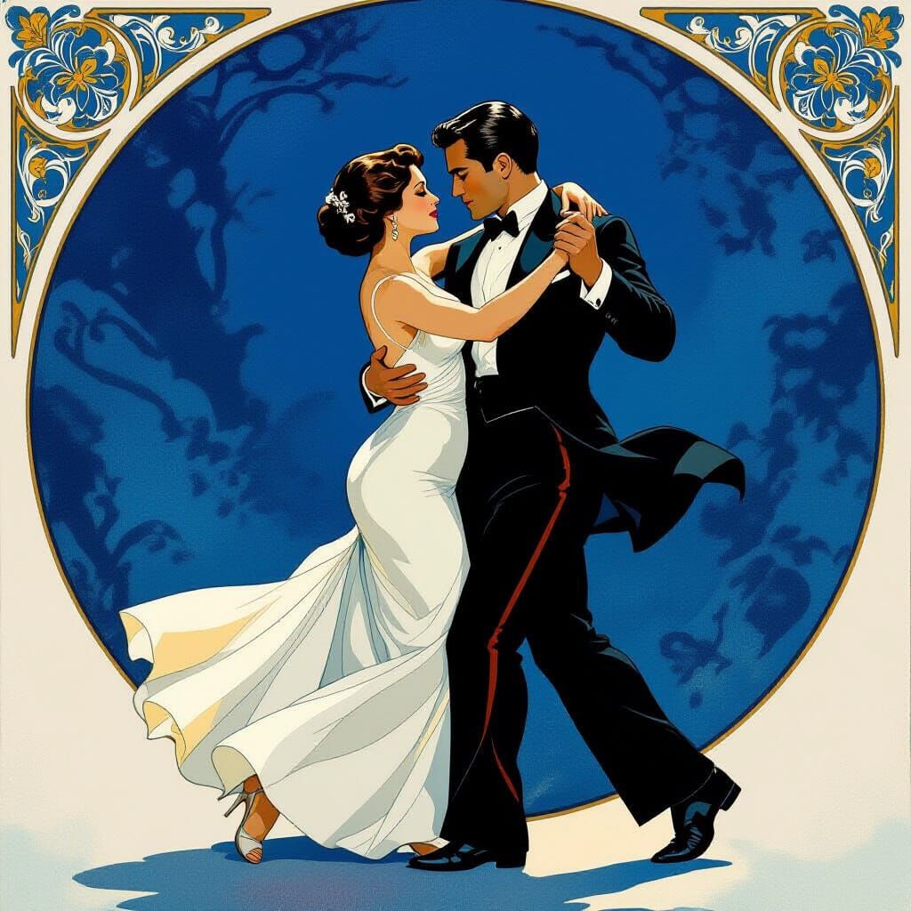This image shows elegant tango dancers in white against a deep blue backdrop. The artwork evokes art nouveau aesthetics with dramatic lighting and expressive brushwork.
