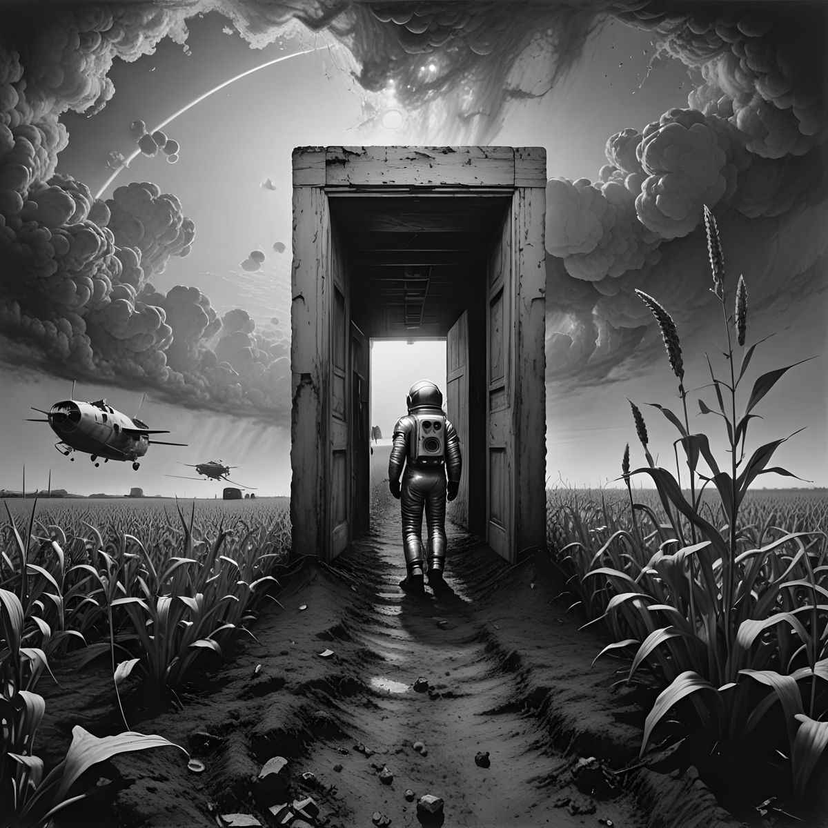 This image shows a silver nitrate photograph of an astronaut encountering Amish farmers and a cat emerging from a floating doorway in a cornfield, rendered with hyperrealism and volumetric lighting in a steampunk style.