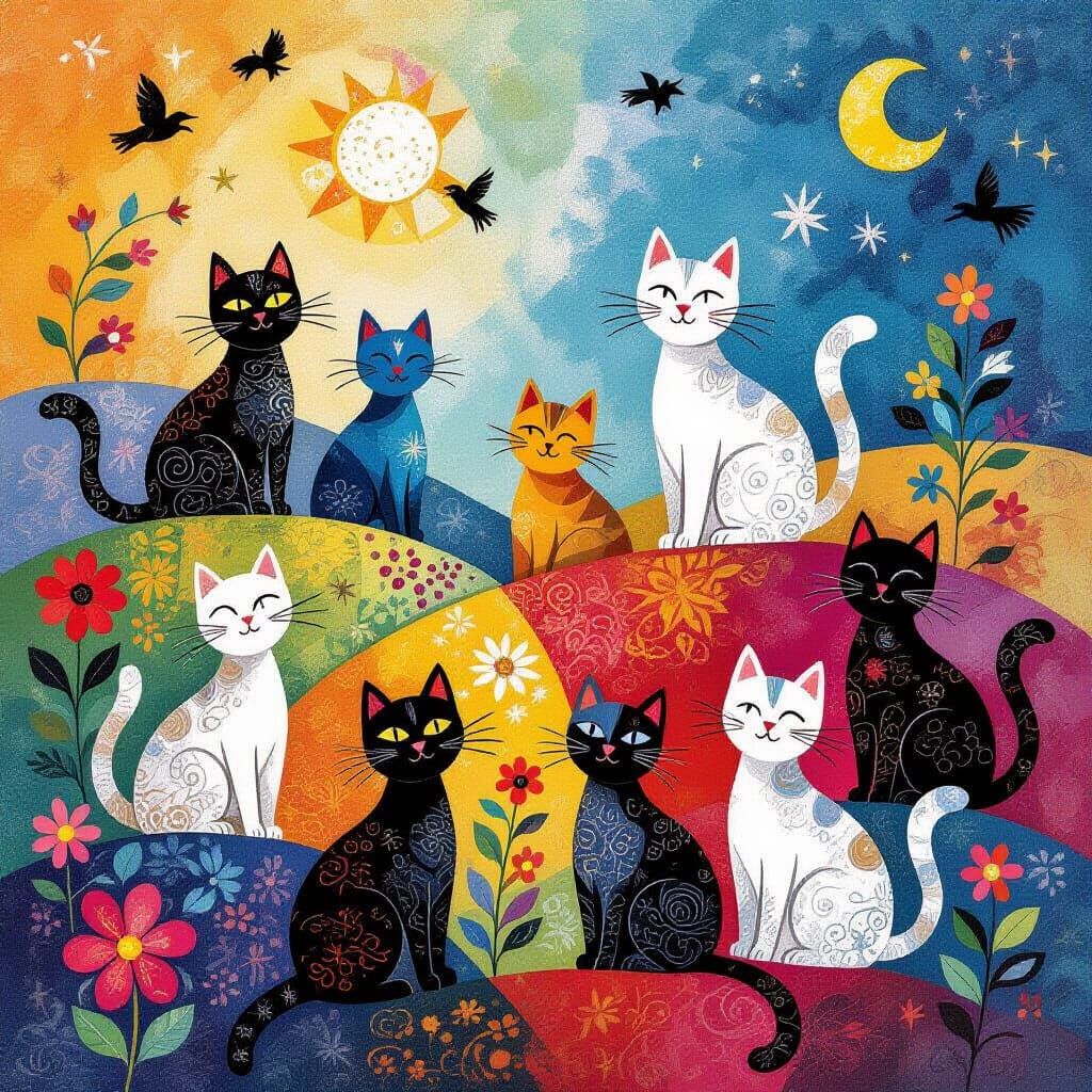 This image showcases a vibrant, colorful hill covered in playful cats, rendered in a watercolor style with color gradients. It features abstract vector elements and fractal patterns.