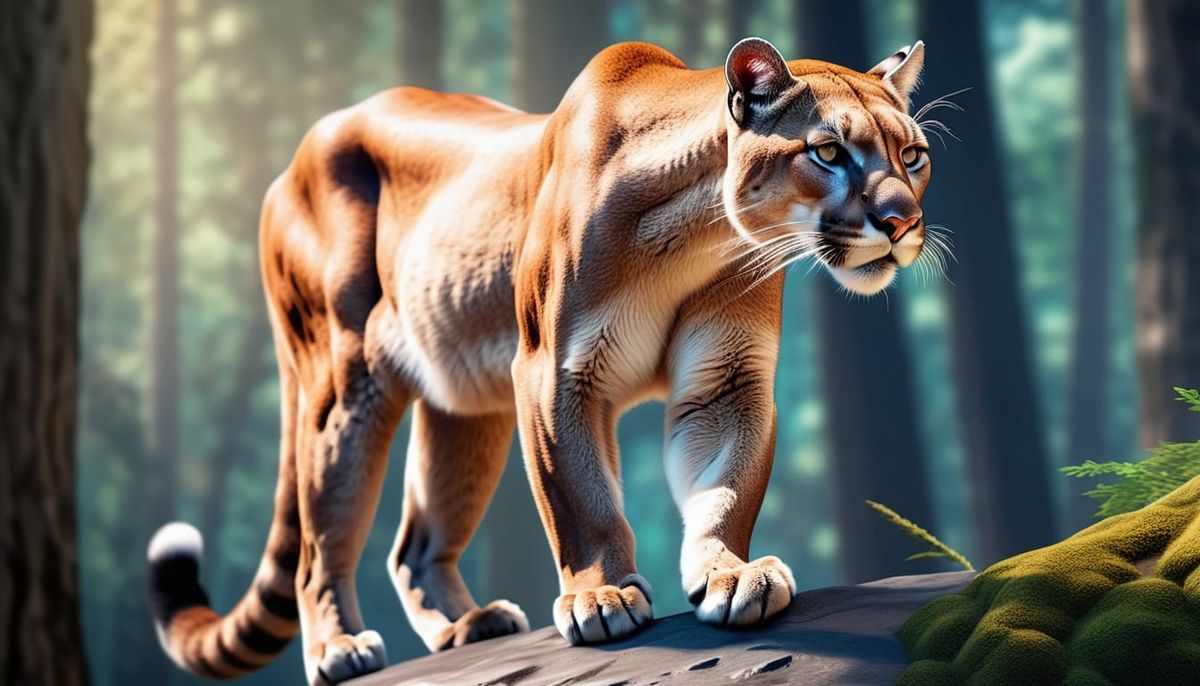 A striking picture of a cougar in a natural habitat. The animal is captured in sharp focus with a blurred background, using professional photography techniques and vibrant concept art.