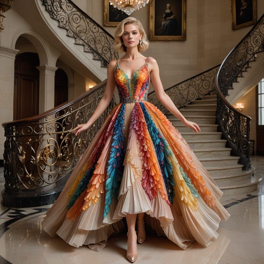 This image showcases a beautiful, highly detailed pleated dress made of colorful, glossy thin glass. The dress is worn by an attractive light-haired woman standing by a grand staircase.