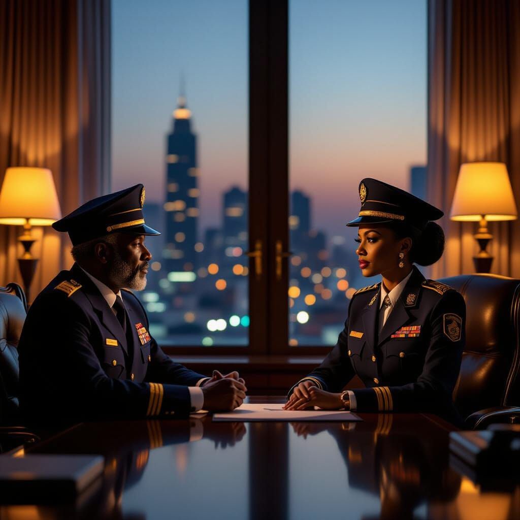 This photorealistic image captures a tense scene in a dimly lit modern office. A powerful Nigerian businesswoman meets with an elderly guard, rendered with dramatic lighting and rich textures.