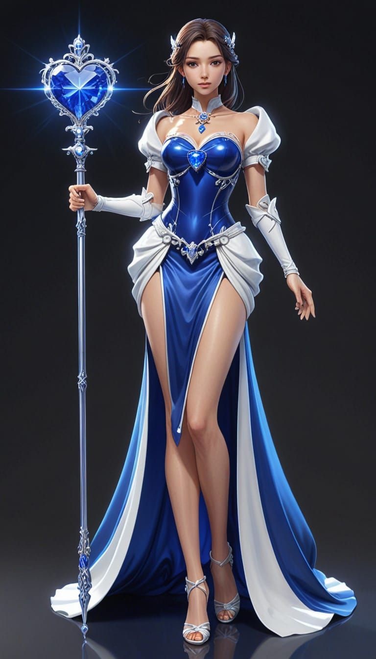 This image shows a full-bodied anime-style woman with a staff, rendered as 3D digital art. She is dressed in vibrant royal blue and white, with shining and glowing sapphire jewelry.