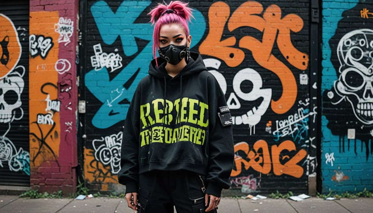 This image shows a young female street artist in an oversized urban outfit, staring intensely at the camera. She wears a cybergoth mask with neon accents, complemented by layered streetwear in a raw underground style.