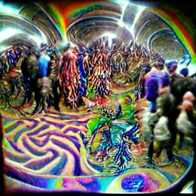 A hallucinatory scene of people spinning planets within a kaleidoscopic, rainbow-colored galaxy. The psychedelic artwork features human figures, eyeballs, and dragon-like forms in a cosmic mirror maze.