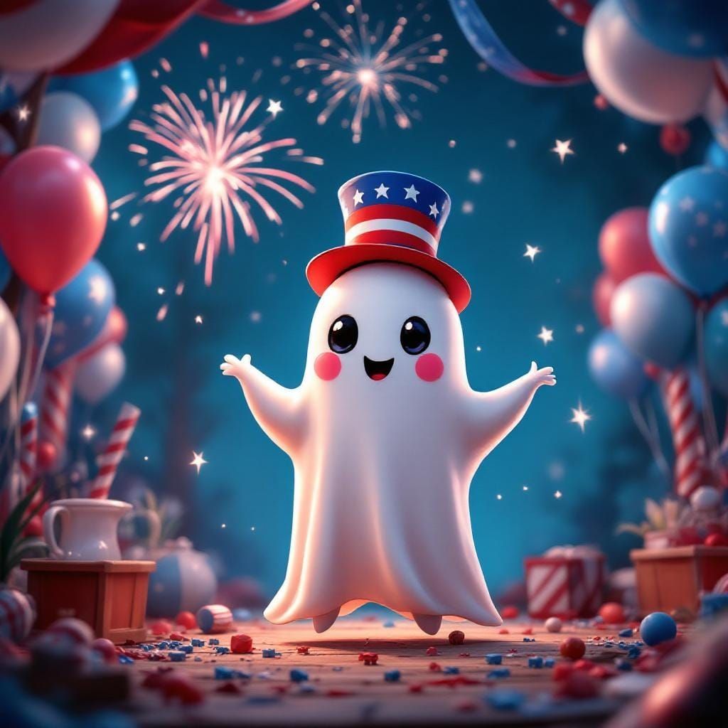 This image shows a cartoon ghost in patriotic attire amid festive decorations. It features red, white, and blue balloons and fireworks, rendered in a detailed, colorful matte painting style.