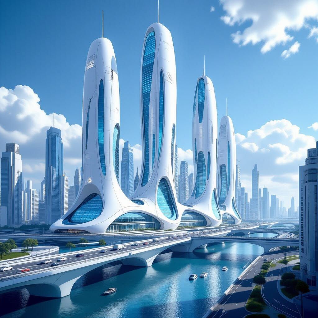 This image showcases a vast futuristic metropolis with towering helical white buildings featuring vibrant blue windows. Intricate skyways weave through the city under bright daylight, rendered in a cinematic concept art style.