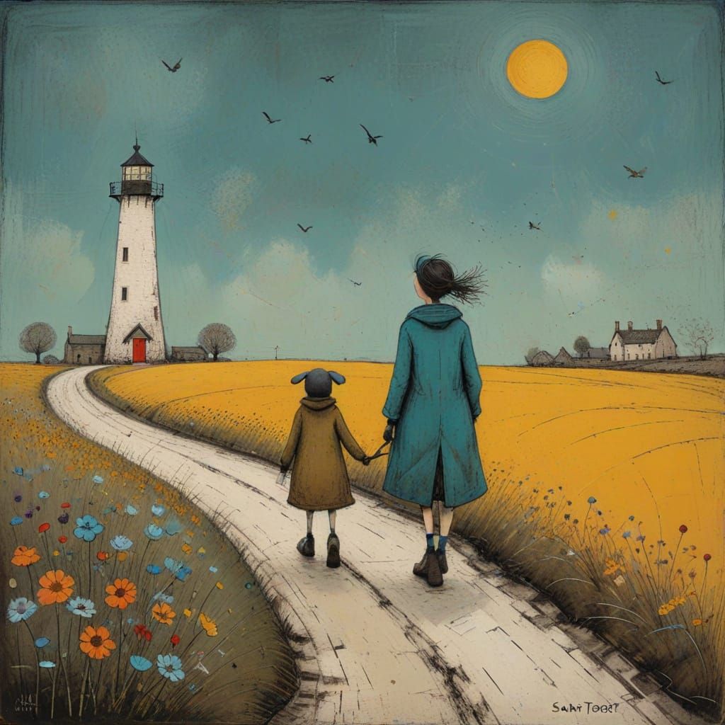 A digital painting of a joyful scene with vibrant colors. The artwork evokes a sense of whimsy and charm, reminiscent of naive art.