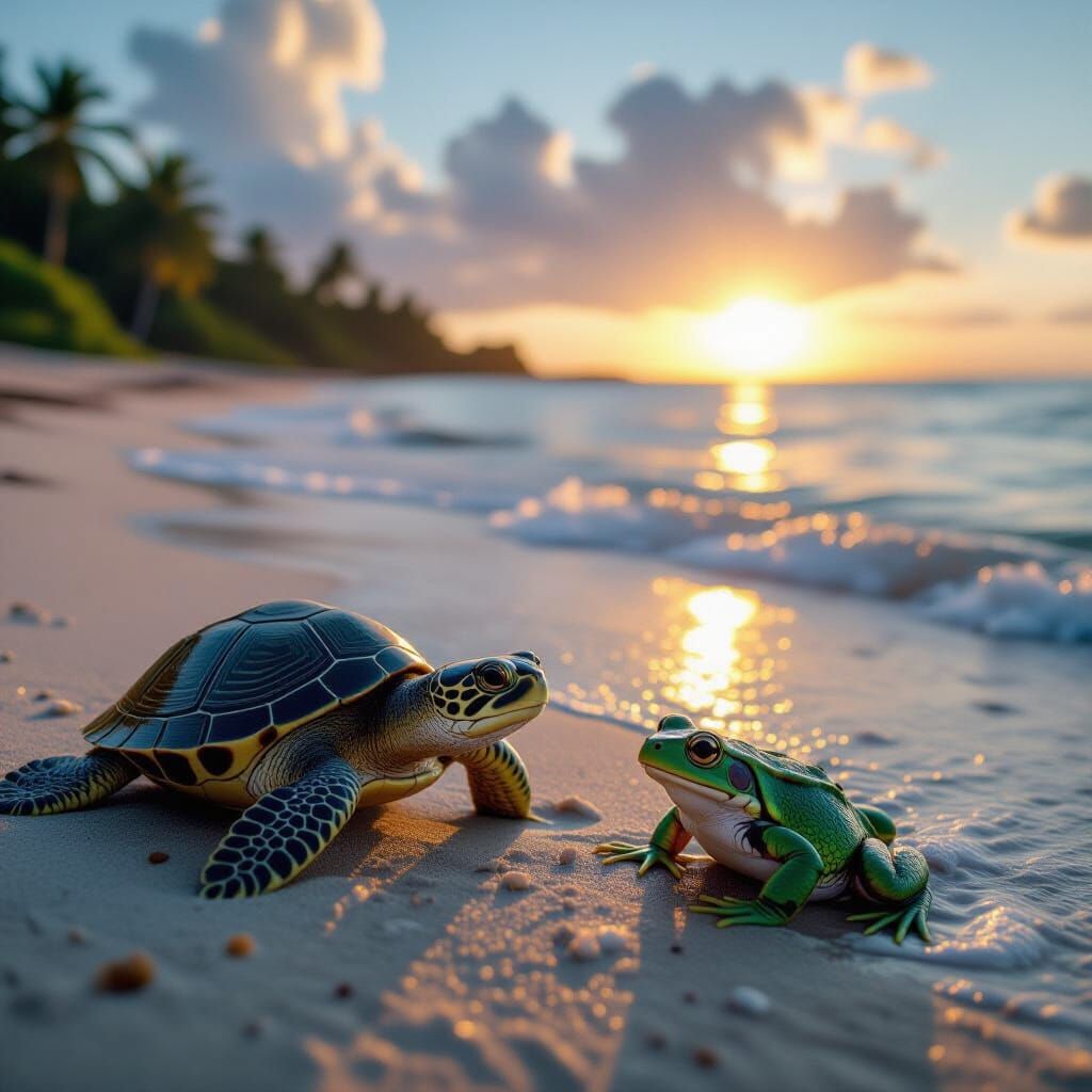 Generate your own cinematic film stills of turtles and frogs by the ocean. Free, easy, and fun!