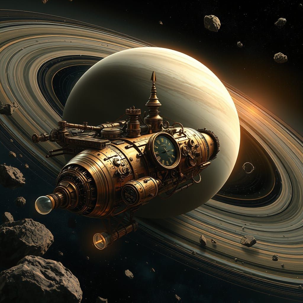 A wide digital painting of a copper steampunk spaceship navigating Saturn's rings amidst asteroids and space debris. The artwork features rich textures, dramatic lighting, and epic fantasy elements.