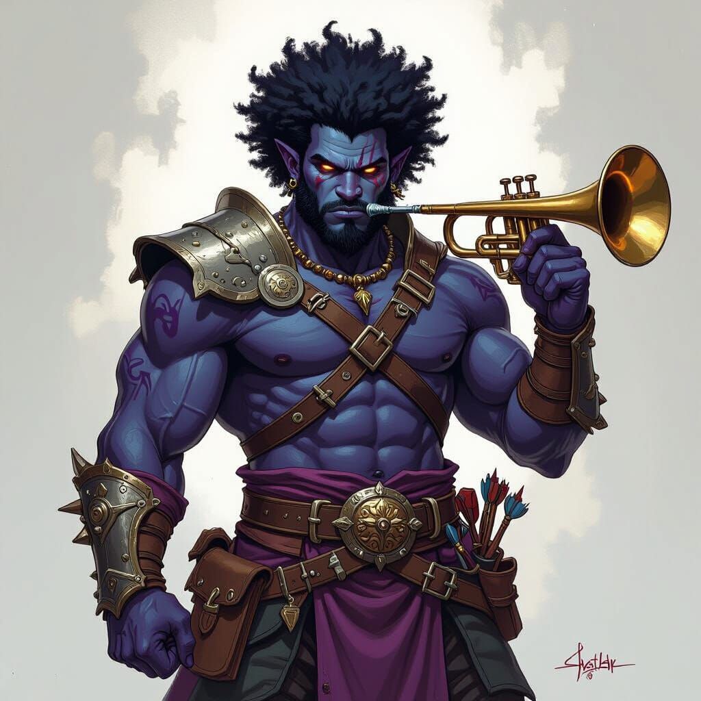 A striking picture of a half-orc rogue, towering and muscular, with a distinctive afro and purple skin. He's equipped with light armor and tools, rendered with dynamic fantasy elements.