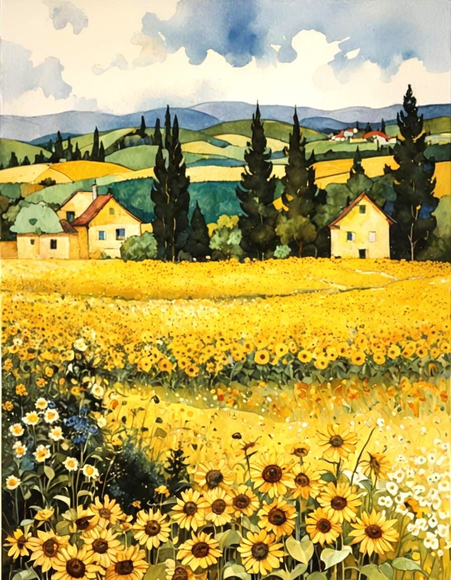 Yellow Sunflowers garden Sculptures watercolor with summers shades of a very bright yellow background, 3d White flowers yellow margarittes tangled thin stems 3Dpoppies petals points of delicate leaves...