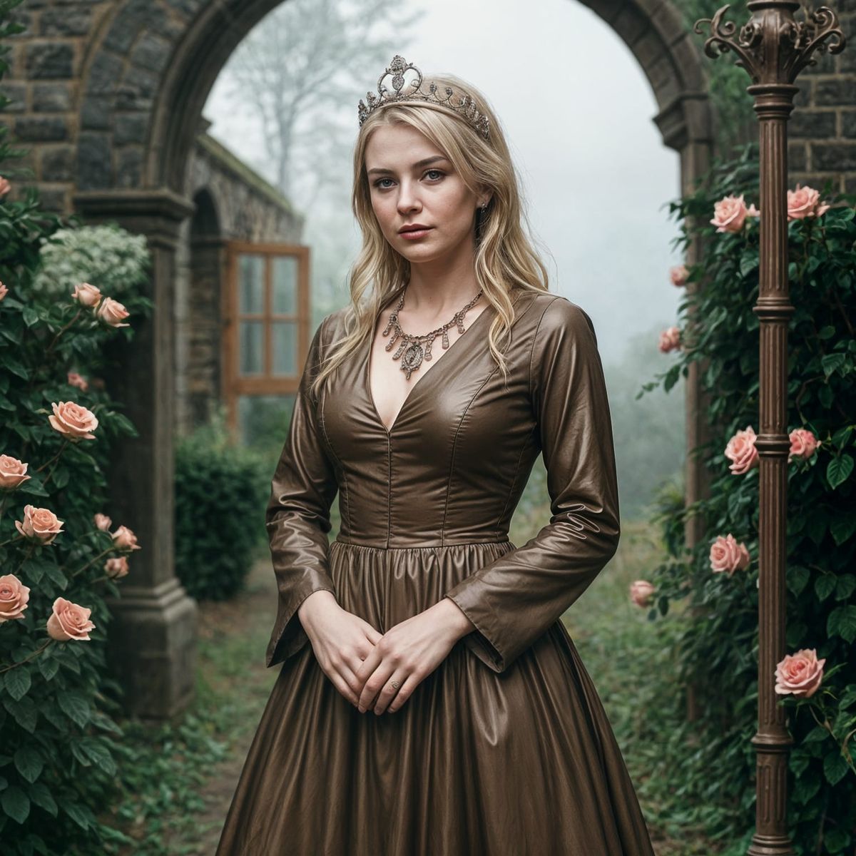This image shows a 50-year-old blonde woman in a shiny, wide-skirted Victorian dress, adorned with a necklace and tiara, standing in a foggy forest archway with roses.