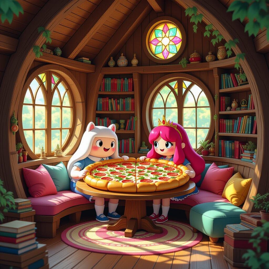 This image shows Finn and Princess Bubblegum enjoying a massive pizza in a detailed, sunlit treehouse. The art style is reminiscent of classic fantasy concept art with vibrant lighting.
