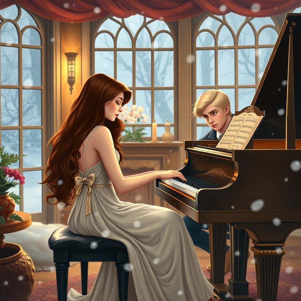 This image shows a woman playing piano in a warmly lit room, observed by a friend. Snow falls gently outside. The scene blends hyperrealism with art nouveau elements.