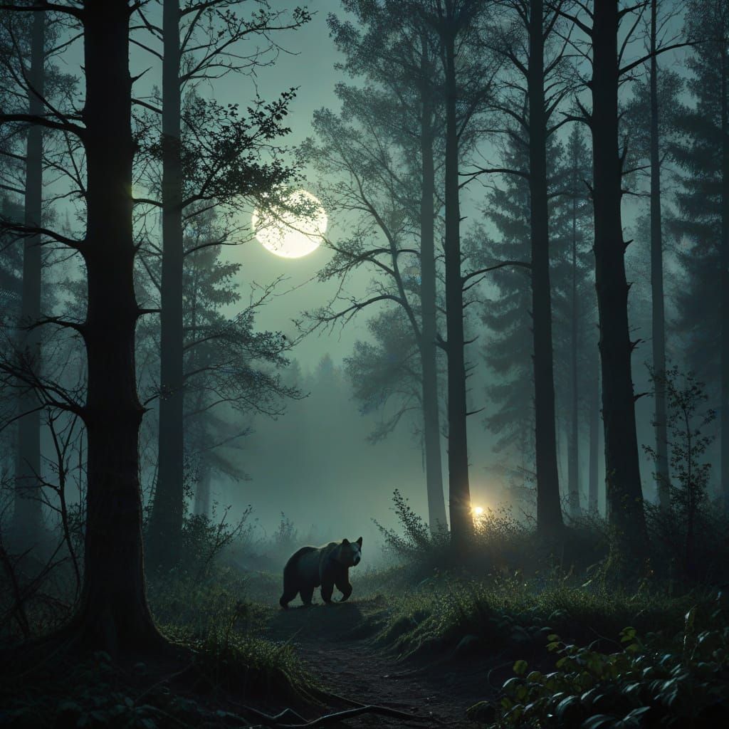 This image captures a mystical scene of a bear standing amidst a gray-green forest, set against the eerie atmosphere of a total solar eclipse at dawn. The soft, diffused light creates a subtle gradient, with branches silhouetted against the solar corona glow.