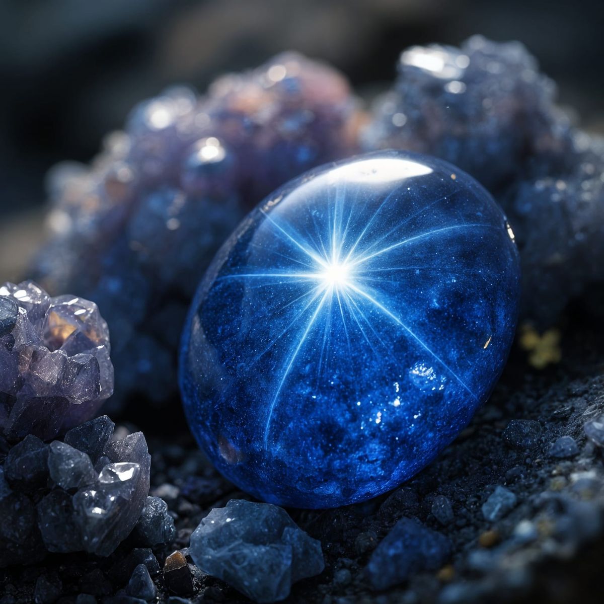 This image shows a star sapphire cabochon surrounded by uncut sapphire crystals, brightly illuminated. The composition highlights the gem's polished surface against the raw texture of the other stones.