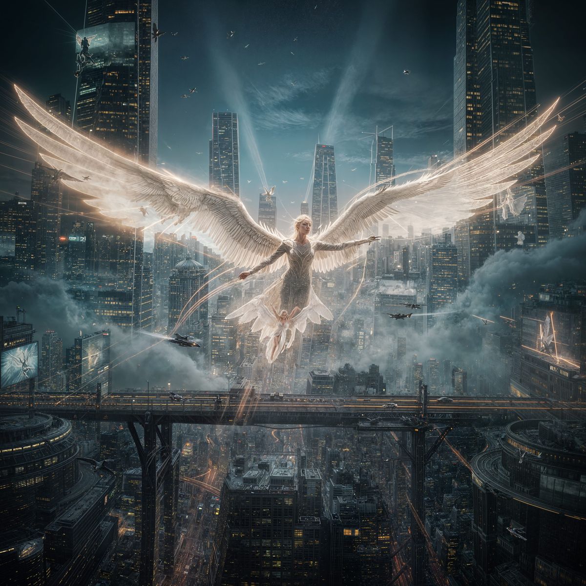 Generate your own stunning images of angels flying at light speed through city skies. Free and easy AI image creation.