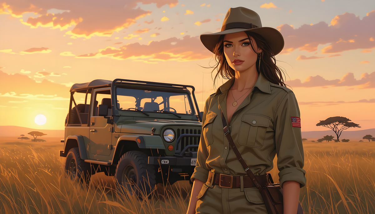 This image depicts Anastasia Baranova in safari attire, set against an African savannah sunset with a jeep in the background. The scene is rendered with vibrant colors and intricate details in a digital art style.