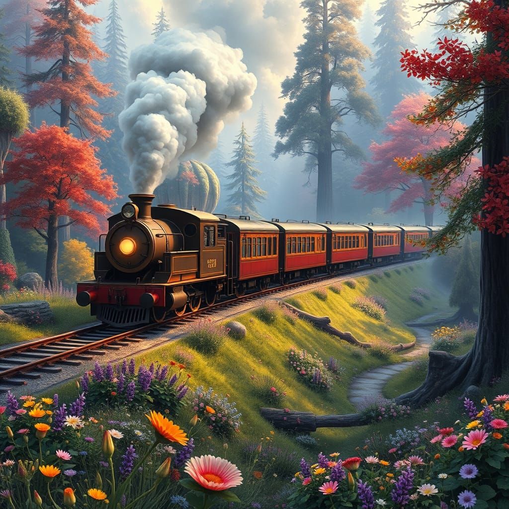 This enchanting image shows a majestic train chugging through a lush, vibrant fairy tale forest, teeming with wildflowers and towering trees, in a dreamy, hyperrealistic style reminiscent of classic children's book illustrations and concept art.