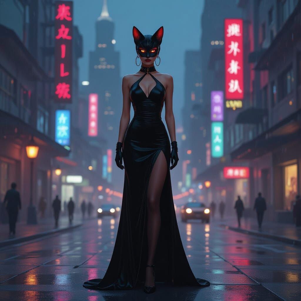 A striking picture of a Khajiit woman in a black dress and pantyhose, standing in a vibrant nighttime city. The image evokes a neon-lit metropolis with dark mysticism and vibrant digital art colors.