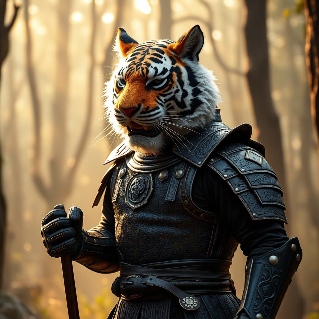A striking picture of a tiger warrior in an ancient forest. The image is a cinematic still with golden light and mist, evoking a sense of wonder. The style is reminiscent of 35mm film.