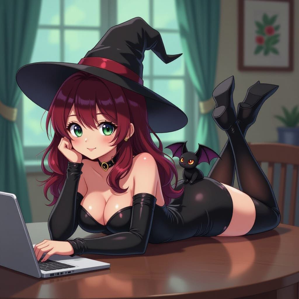 A cel-shaded anime woman with crimson hair and green eyes in a black dress and witch hat reclines on a table with a bat on a laptop. Created with Clip Studio Paint in a manga scan aesthetic.
