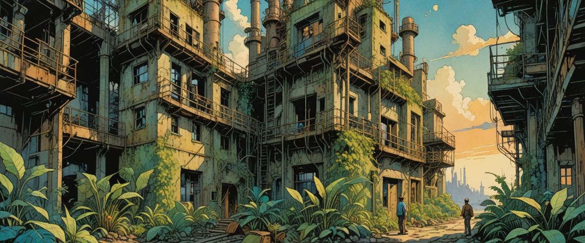 Easily generate your own unique images of abandoned factories with tropical plants, rendered in a cool retro comic book style.