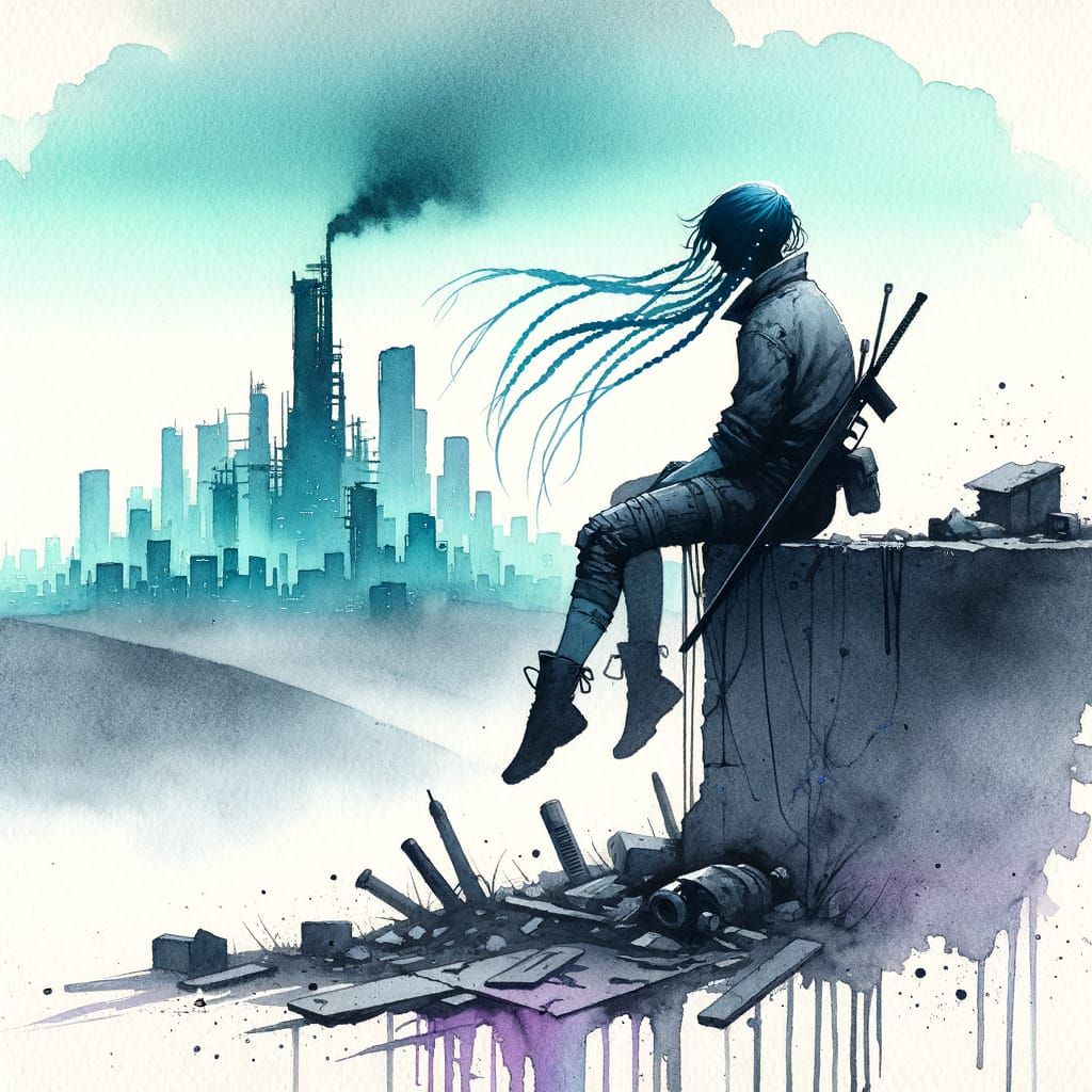 This image shows a lone figure with blue braids on a ruined building. A futuristic city skyline is in the distance. Rendered with toxic teal, ash gray, and shimmer violet watercolor effects, the scene conveys instability and emotional weight.