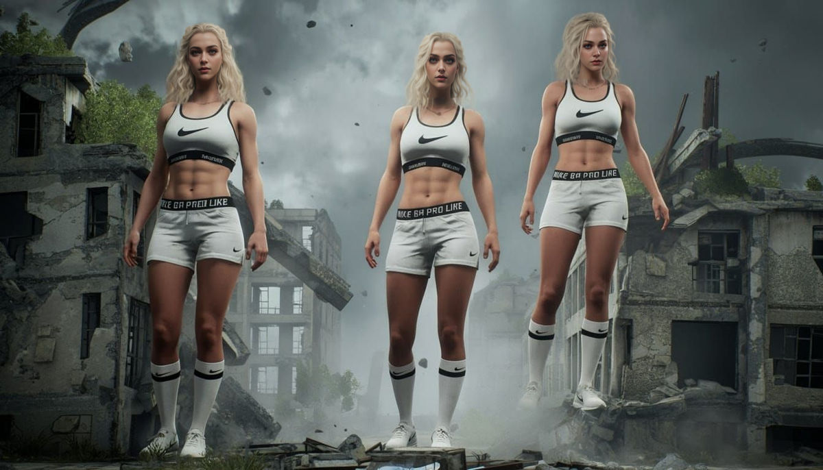This image depicts two giant women, dressed in Nike athletic wear, standing amidst a backdrop of abandoned buildings, created in the style of high-end 3D game art with intricate details and dynamic lighting.