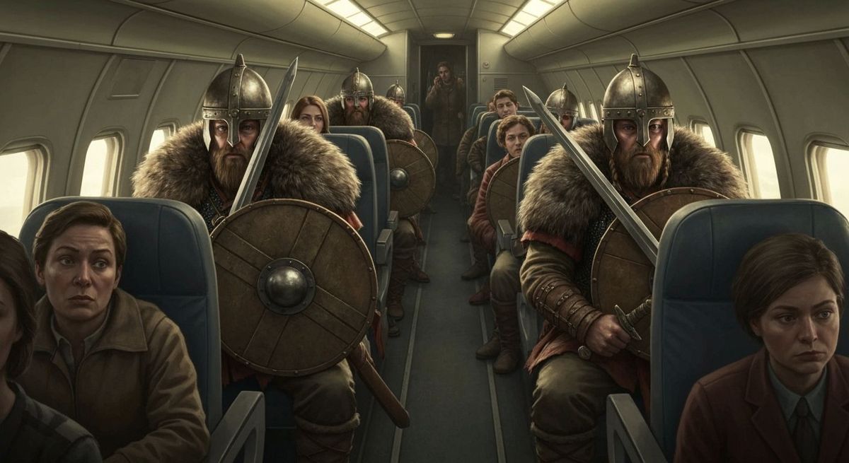 A realistic image of Viking warriors in airplane seats amidst modern passengers. They wear traditional fur-lined attire while holding swords and shields, with detailed textures and a nostalgic atmosphere.